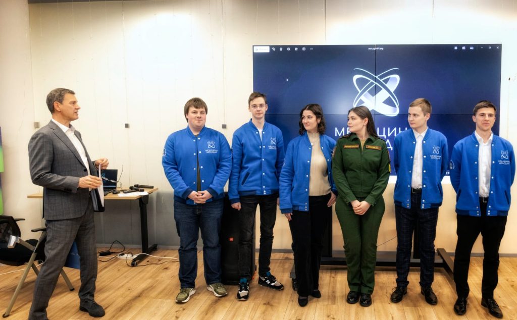 На снимке- победители конкурса с руководителем научного направления Фонда им. В.П.Филатова Олегом Глазачевым, профессором Сеченовского Университета, во время защиты проектов 14.12.2025
